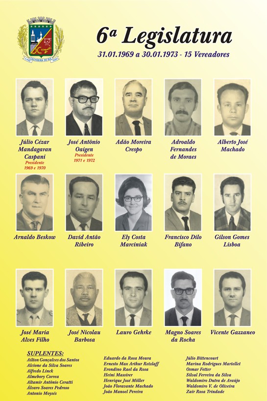 Quadro da 6ª Legislatura (1969-1973) da Câmara de Vereadores de Cachoeira do Sul. Essa com 15 vereadores.